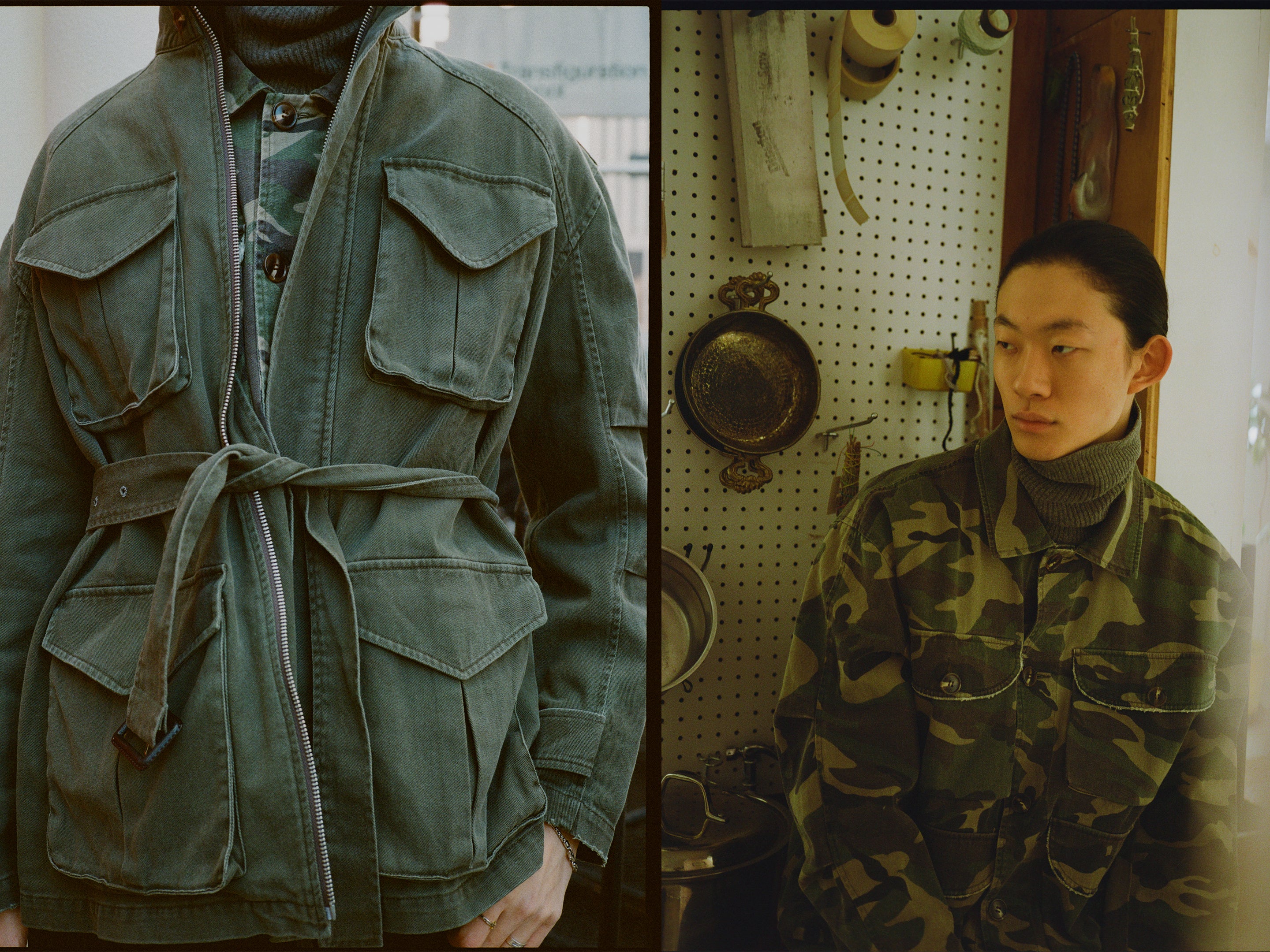 Inspired by a military aesthetic and woodland camouflage, this capsule honors nature’s resilience with durable fabrics and functional design.