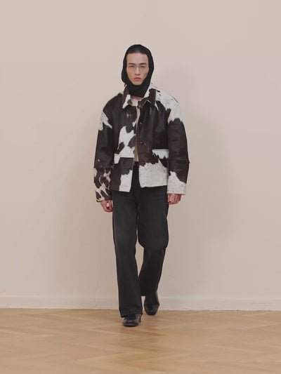 Crafted from genuine leather, our Cowhide Jacket stands out with its striking, organic pattern from the natural hides. The earthy palette of dark brown and off-white makes each jacket unique, as no two markings are the same. The design is finished with straight lines, large flap pockets, and a crisp collar that grounds the bold print in classic workwear. The jacket’s substantial weight and construction give it resilience, while the irregular, organic surface lends a tactile authenticity. Over time, the leather will soften, allowing the garment to take on a shape and patina entirely its own.
