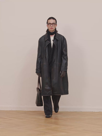 A statement coat that only gets better with time. Crafted from 100% genuine leather, each trench is uniquely hand-distressed with dark-brown fading, subtle creasing, and a rich patina that deepens over time. The elongated, structured silhouette features a double-breasted front closure, while tortoise buttons and tonal stitching highlight the aged texture.
