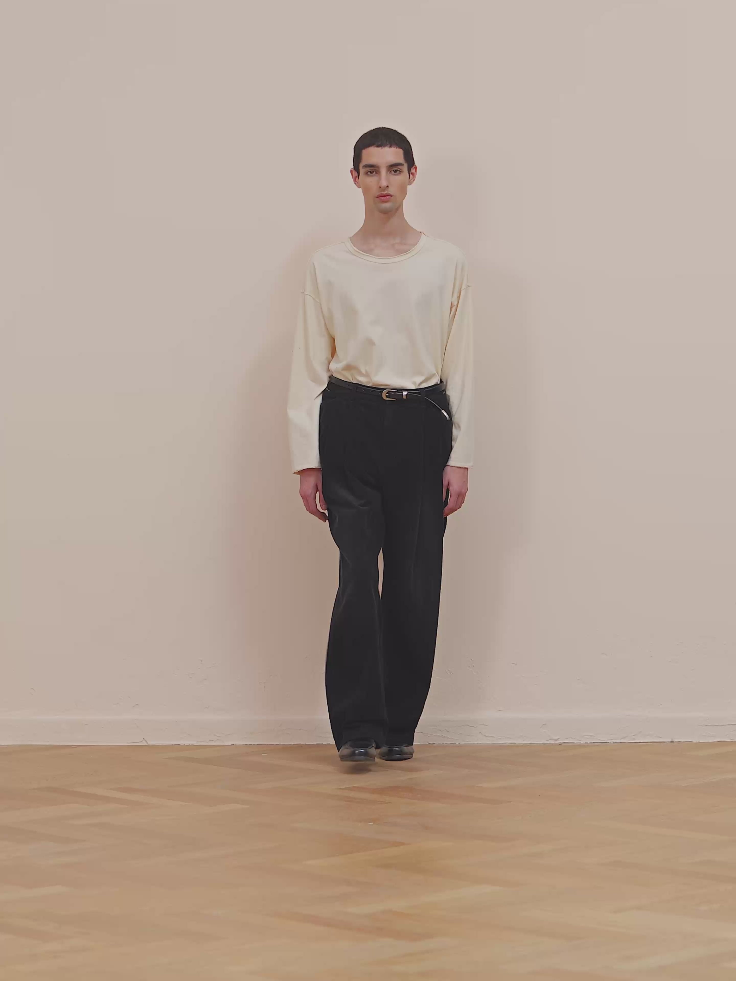 Our spin on a classic silhouette - the double pleated trousers in sand-toned corduroy. Featuring a double pleated front, mid-rise, side slip pockets, and adjustable waist tabs. It's designed to have a wide leg, relaxed fit.