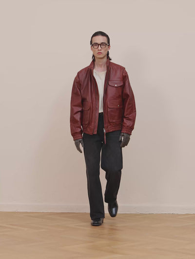 Our Leather Bomber Jacket is cut from premium genuine leather with a naturally distressed finish. The silhouette is relaxed and slightly cropped, with elasticated cuffs and hem providing a comfortable, utilitarian fit. Large flap pockets with welted pockets within them anchor the design in functionality, while tonal variations in the leather’s finish give the garment a singular patina. Designed to endure, the jacket softens with time, gradually taking on the shape and story of its wearer.