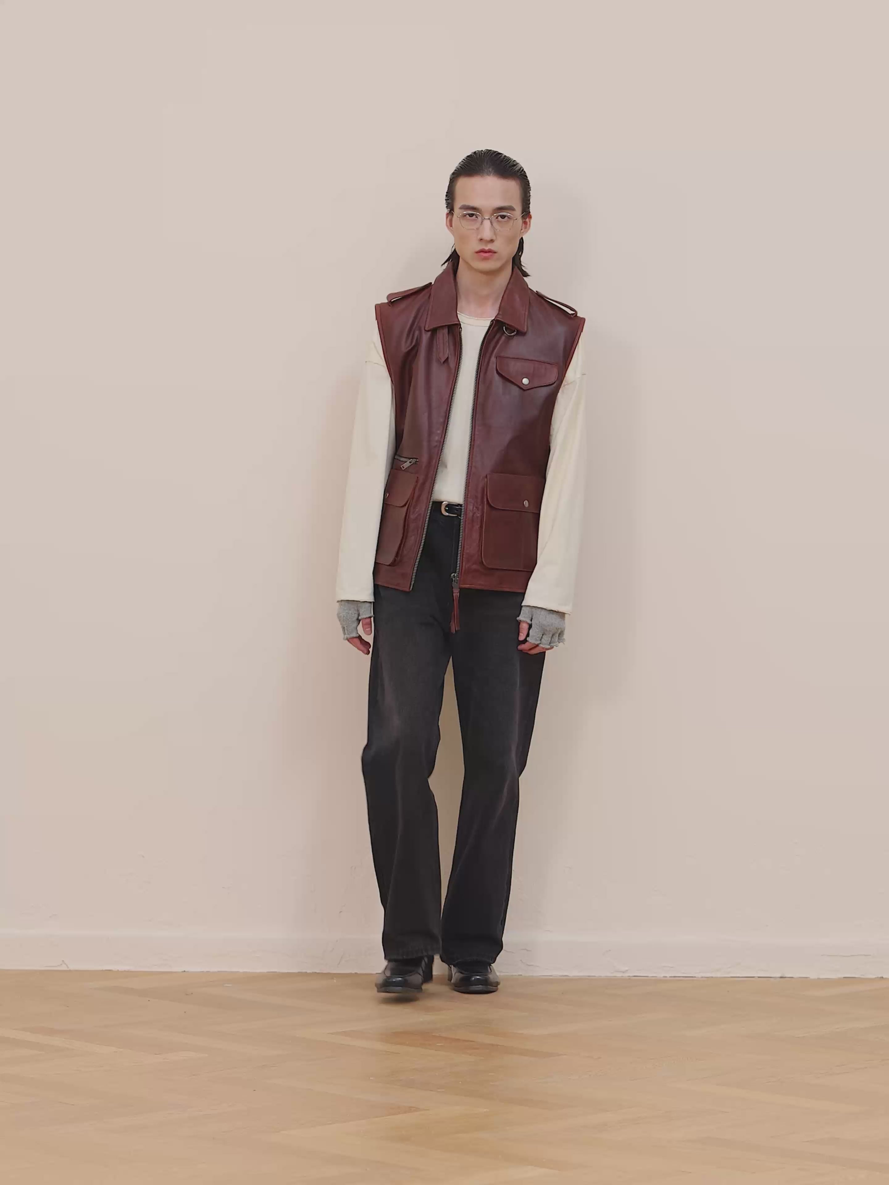 Rugged functionality with a refined finish. Our Leather Pocket Vest is cut from richly distressed brown leather and features a classic stand collar with buckle detail, reinforced shoulder straps with snap buttons, and multiple utility pockets with both zip and flap closures for detail and versatility. Its structured silhouette is balanced by adjustable side tabs and a back buckle, offering a tailored yet relaxed fit. Designed for both urban wear and practicality, each vest is ethically crafted in Pakistan from hand-selected hides—making every piece unique. Over time, the leather softens and patinas, building character with every wear.
