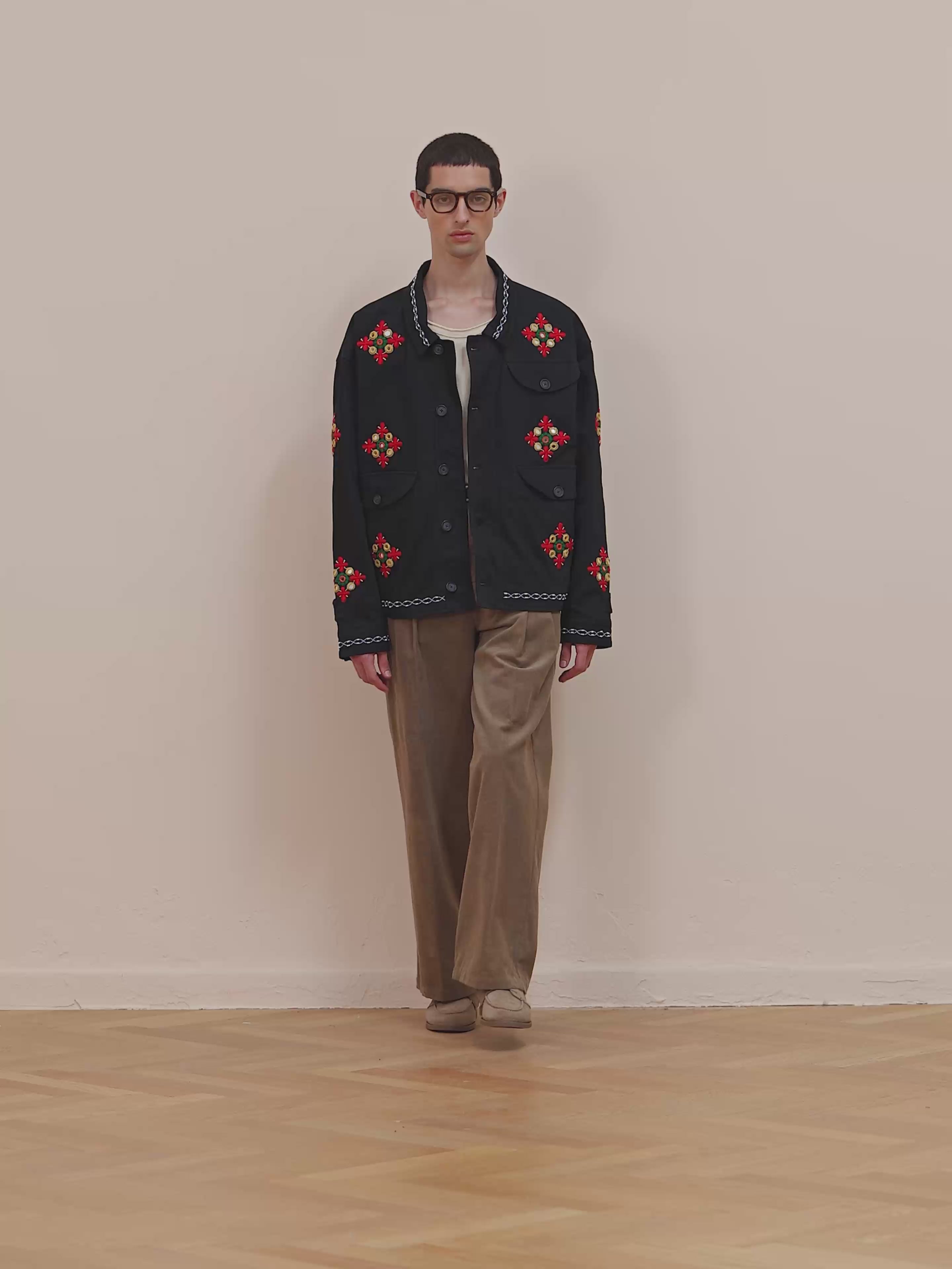 A structured cotton twill jacket adorned with hand embroidered diamond motifs, each centered with traditional mirror detailing. The design repeats across the chest, sleeves, and back, accented by contrast stitch, beaded borders along the hems and collar. Featuring a classic point collar, tortoise buttons, and three front pockets, it’s a contemporary nod to ornate handwork rooted in regional textile heritage.