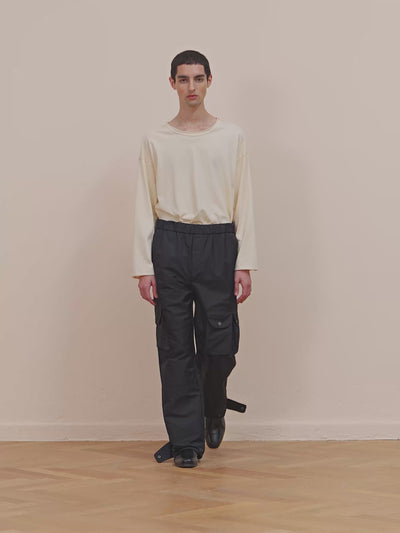 Lightweight nylon with a soft hand feel and subtle sheen forms the foundation of the Nylon Cargo Pant. Oversized flap pockets, snap closures, and adjustable hem tabs add versatility, while an elastic waist ensures comfort. Cut in a relaxed fit for ease of movement, it’s a modern take on functional gear—practical yet elevated.