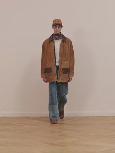 Our Suede Contrast Chore Jacket fuses rustic Americana with elevated craftsmanship. Made from rugged suede, it features a contrast brown burnished leather collar and pocket flap, evoking classic western shapes. Thoughtfully detailed with a curved yoke stitch and distressed edge hem, its relaxed silhouette offers everyday versatility with a vintage soul. Antique matte silver buttons, a single chest pocket, and twin waist flap pockets make it as functional as it is distinctive. Ethically manufactured in Pakistan, each jacket carries its own one of a kind texture and tone that evolves with age.