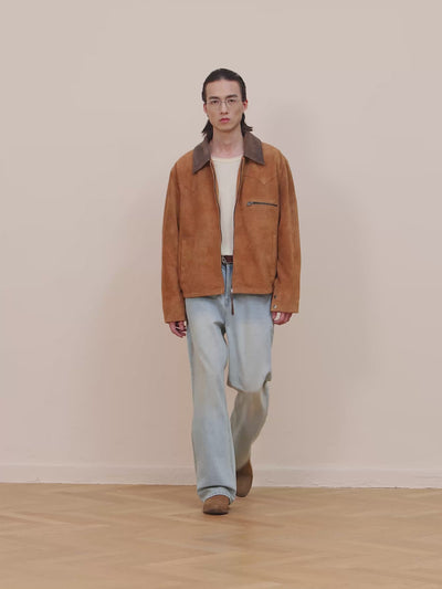 Our Suede Work Jacket is constructed from 100% genuine, brown-toned suede leather, it features a high-contrast distressed brown leather collar and a dual full-zip front. Western yoke stitching adds subtle character, while the boxy cut gives it a contemporary, easy-to-layer shape. A single chest zip pocket and welted waist pockets offer both form and function. Ethically crafted in Pakistan, each piece is cut from unique hides, ensuring no two are ever the same. Over time, its texture softens and its color deepens, telling the story of every wear.